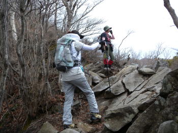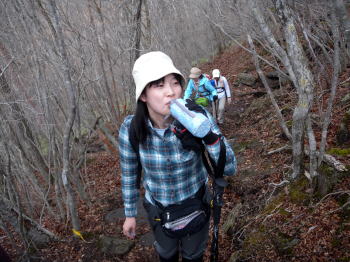 牛伏山愛好会のしげさんではなく“ひでさん”はマイペース歩きで安定しています。駒ヶ岳との分岐に到着し、「もう一息!」と、しばしの安堵感を味わいます。