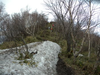 残雪の上を歩いて山頂へ向かいます。百名山らしからぬ山頂標識に賛否両論ですが、点の一つ多い、『黒檜山』の黒の誤字がやはり気になります。