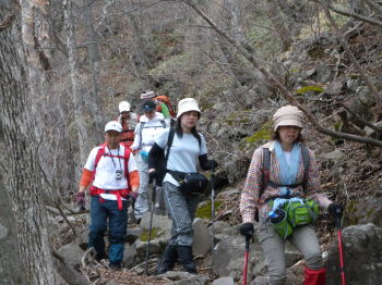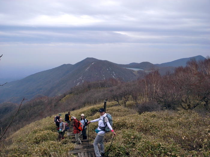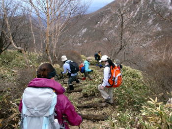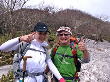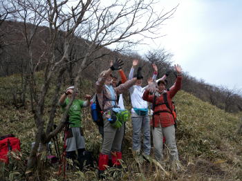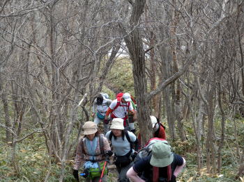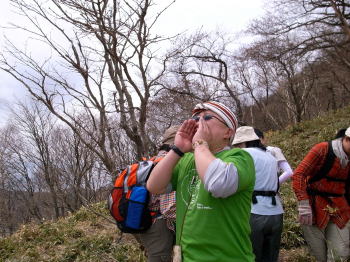 大タルミ手前の丘の上から駒ヶ岳めがけ恒例の「ヤッホ〜」です。若者が振り返えり様にヤッホーを返してくれます。浅草からお越しの“抹茶親分”も張り切って「ヤッホ〜」ですが・・・・あれ〜?皆はさっさと移動の準備!