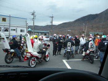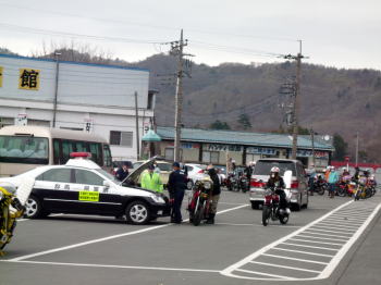 1台のバイクがバッテリー上がりで、正義の味方パトカーより電力補給!マイクロバスの前は関東一円から集まった若者です。この素晴らしパワーを違った形で使えば凄いですね〜!