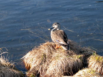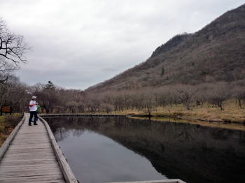 シーズン前の静かな覚満淵には優雅に鴨がたわむれています。しばらく湿原の木道より静かな景色を眺めます。