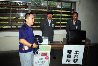 駅舎のホームの改札口では退屈そうなJRの職員が観光用の記念切符を販売しています。浅草からお越しの祭りが大好きな信笑さんは、JRの職員の仕事を何故か増やしています。