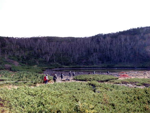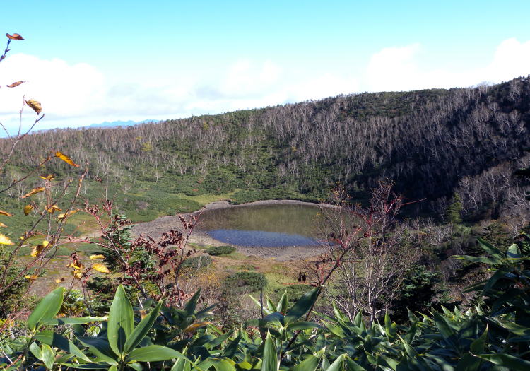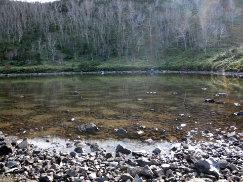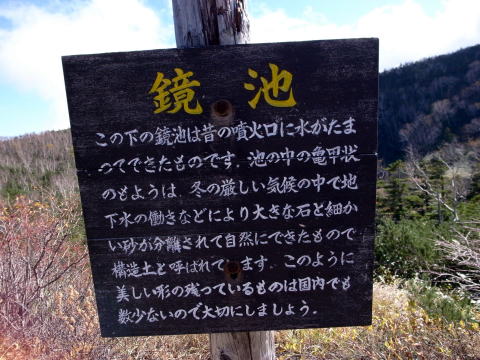 | 鏡池は湖底に珍しい模様のあり、噴火によって形成された火口湖です。下山途中に見えた鏡池は昔の噴火によってできた湖、そして、湖底を見るとカメの甲羅のように見える大変珍しい湖底です。石と砂が地下水によって分離され、自然にできた模様で「構造土」と呼ばれる、国内でも数が少ない現象だそうです。 |