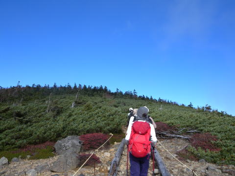 うわ〜!真っ青な空、緑の這松、真っ赤なアリスさんのザック、いいですね