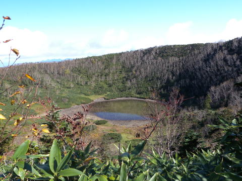 噴火によって形成された火口湖の鏡池が眼下に見えます。
