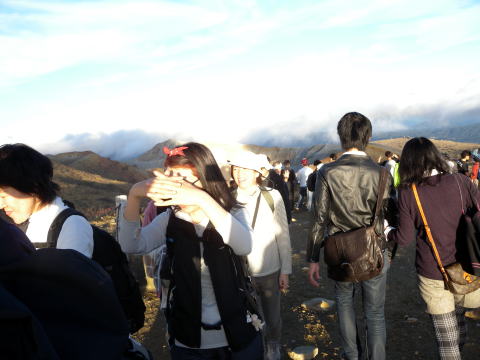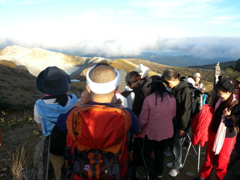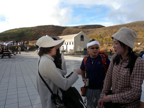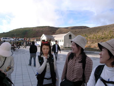 満員状態の展望台より湯釜に向けて雄叫びを放っている娘達がいます。恒例の「ヤッホー!ヤッホー!」と。 良く聞くとやまびこになって返ってきます。