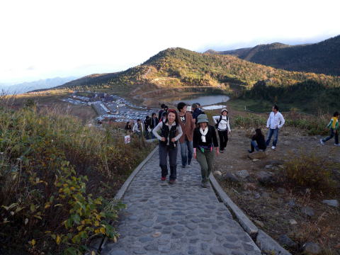 湯釜が西陽に浴び、火星調が金星調に映って見えたのが印象的でした。以前の展望台より、湖は遠くなってしまったが少し残念です。