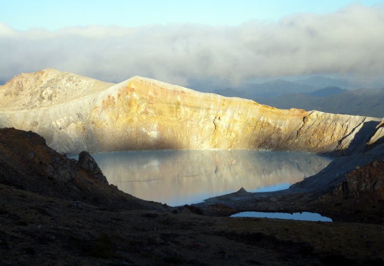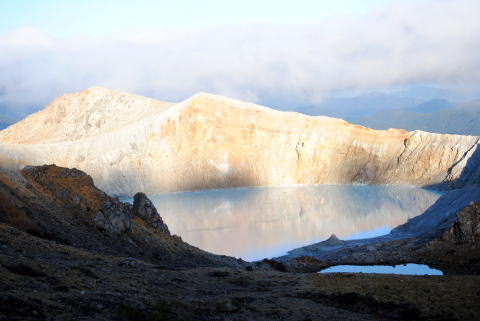 湯釜(ゆがま)は、直径約300m、水深約30m、水温約18℃の火口湖です。エメラルドグリーンの水で知られ、観光名所として人気があります。pHが1.0前後であり、世界でもっとも酸性度が高い湖、と言われています。火山ガスに含まれる塩化水素や二酸化硫黄が水に溶け込み、塩酸や硫酸となったためと考えられています。水がエメラルドグリーンに見えるのは、水に溶け込んでいる鉄イオンや硫黄などの微粒子の影響で、日光の特定の波長の光が吸収されるためだと考えられています。なお、湯釜の水をビーカーなどに汲んでみても、エメラルドグリーンには見えないらしい。