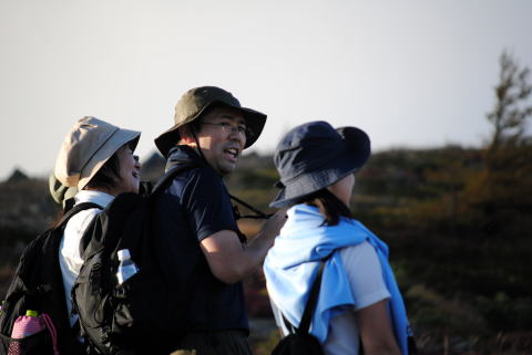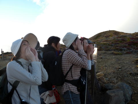 本白根登山コースは比較的起伏が少なく、火山の爪痕や自然が作り出す風景が感じられました。逢ノ峰展望台から北アルプスまでの景色を望め、湯釜では西陽に反射し異次元的な風景を見る事が出来ました。天候にも恵まれ、群馬県屈指の貴重なコースを歩き、本日の自然探索で、自然と共有する効果と自己に対しての自信を獲得されたことと思います。 上記の3人は貴重な男性メンバーです。次回の妙義山でも期待しますので、どうぞ宜しくお願いします。