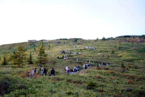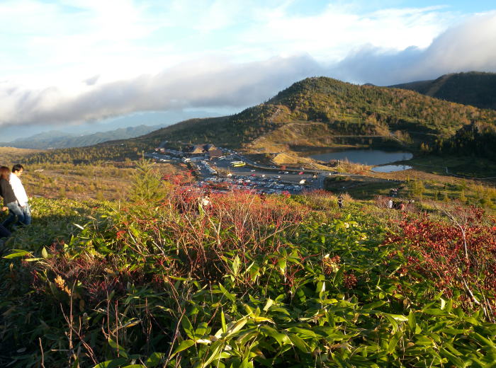 夕方ですが、志賀草津観光ルートのスポット湯釜は、続々と人がやって来ます。私達は西陽に向かって撤収です。