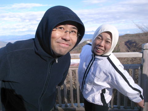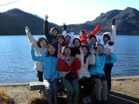 榛名湖と榛名連山最高峰の掃部ヶ岳をバックに。 〜寒い!〜