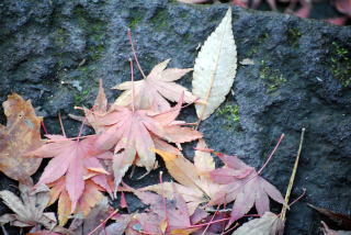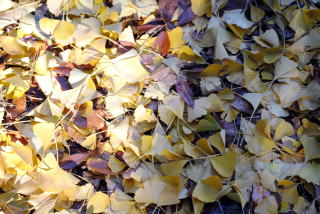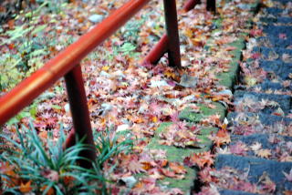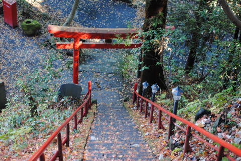 飯縄大権現の小さなお堂付近にイチョウともみじの落ち葉が、秋の終わりを感じさせられます