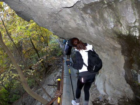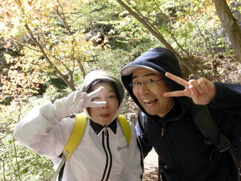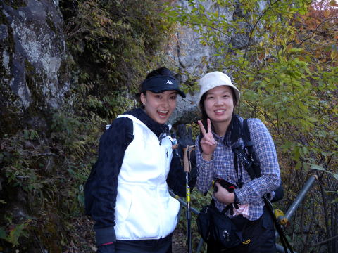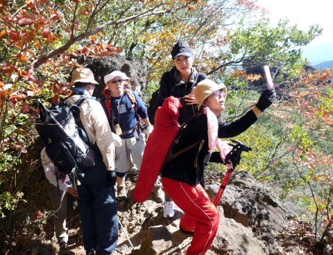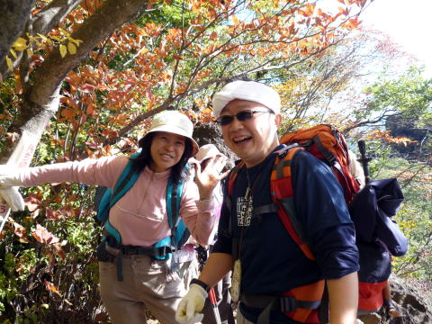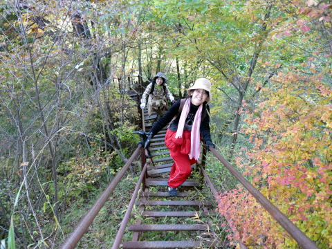細い鉄の階段付近から紅葉の景色に変わっていき、疲れを忘れ笑顔になります。