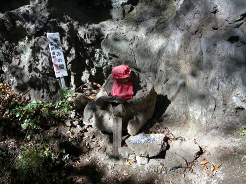 妙義山登山の中間道の中間地点に「本読みの憎」と名づけられたた石があります。良く見ると石の形が丁度座って本を読んでいるかの様に見えます。赤い帽子とよだれかけがトレードマークになっています。