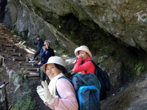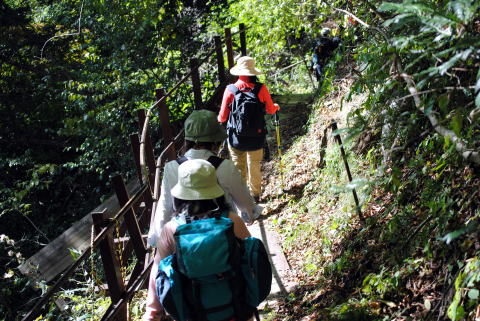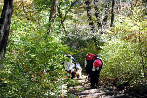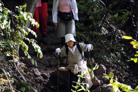 歩数の合わない丸太道を、巧みにステッキを使い登っていきます。歩き慣れない方は、辛い登りになります。