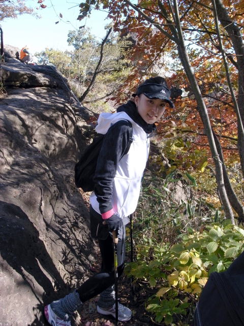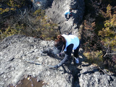 天狗のひょうてい岩脇の頗る高度感のある岩場で、アンさんがポーズです。はなさんも続けてポーズ! 続々と仲間につられ登ってきます。