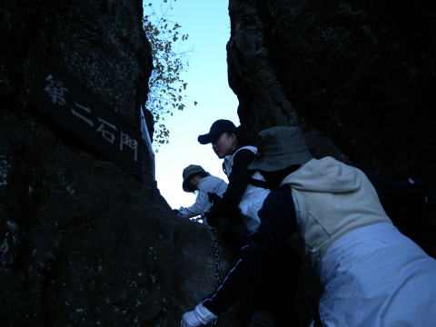 いよいよ中間道から石門群のメイン鎖場の天狗のひょうてい岩に最初から挑戦ですが、注意が必要です。手前の大砲岩からの撮影です。