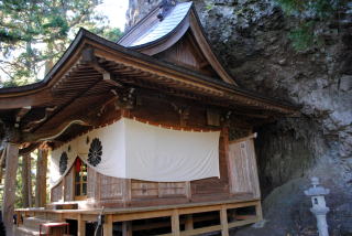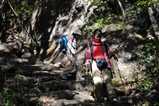 見晴台から長い下りの連続です。中ノ岳神社は石段と岩と神殿が三身一体化していて、神秘を漂わせています。 奥の院には「轟き岩」があり、眼下に奇岩が見わたせます。