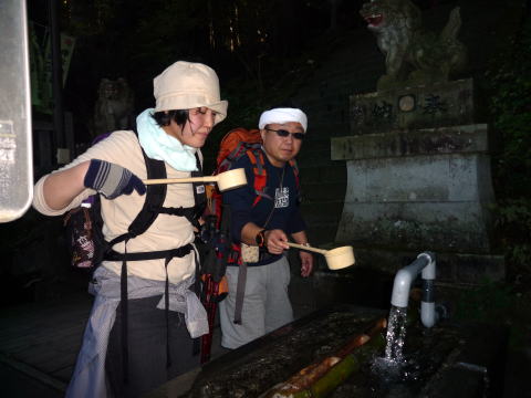 男、信笑さんと一緒に、疲れた体と渇いた喉をお清の水で潤します。