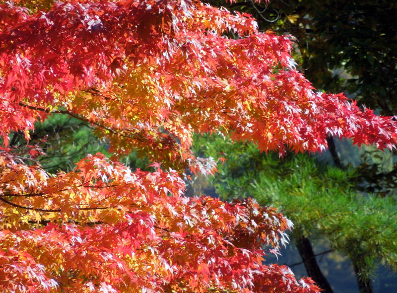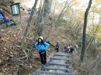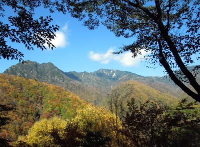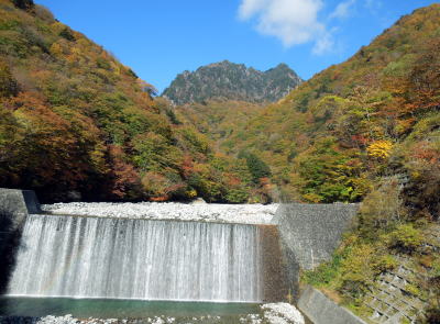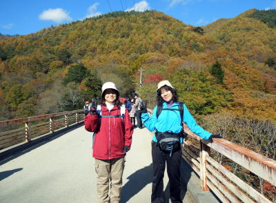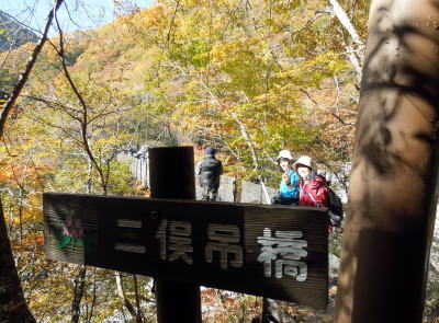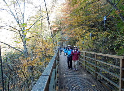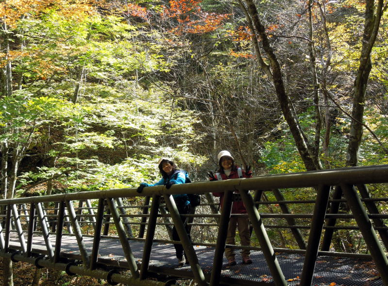 紅葉は今少し早い感じです。観光ルートなので、設備や道は比較的整っていますので、足さえ丈夫であれば誰でも安心して来られます。最初の吊橋を渡ります。川と山のコラボレーションが広がり、美しく感じられるポイントです。
