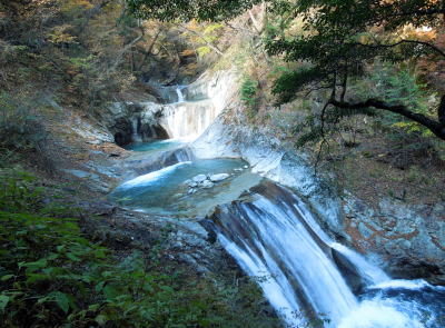 間もなく、クライマックスの七ツ釜五段の滝です。これを見ると、ここまで着た甲斐を感じるくらいの見事に作られた自然の造形です。