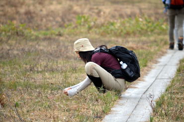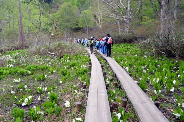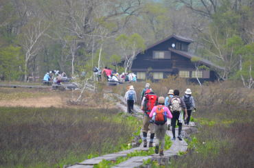 鳩待峠より尾瀬ヶ原が始まる山ノ鼻までは、片道3.3kmのやや下り傾斜の爽快な木道です。自然渋滞の中、森林浴で癒されながら軽快に歩きだします。本日は、尾瀬の代表的な「水芭蕉」をはじめ、お花観賞つきの自然探索ワークを満喫します。