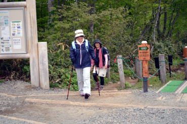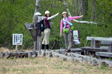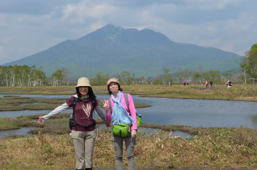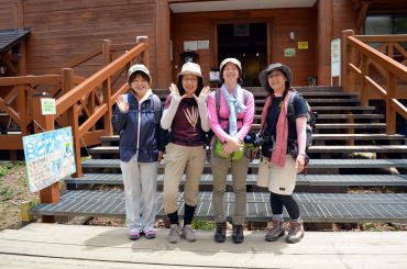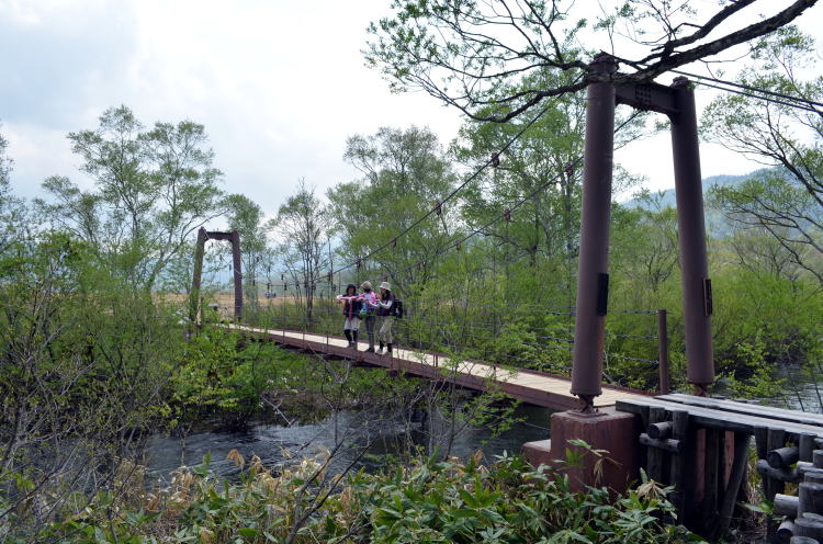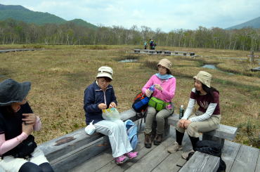 冬眠から目覚め新緑深まる山の鼻から多くのハイカーが木道を往来します。我が尾瀬ガール隊は、遠足チームや中高年ツアーに圧倒されながらも健在です。