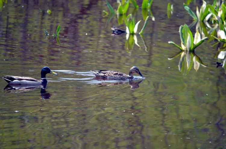 合鴨が優雅に泳いでいます。時折水面に顔を沈ませ餌を突いてます。