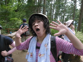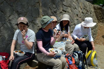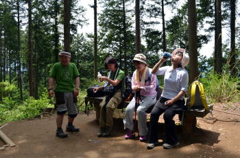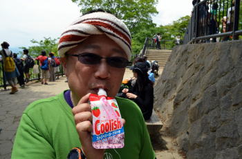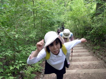 山頂手前、胸突き八丁ともいえる階段手前で一休みです。それにしてもゆめちゃんの豪快な飲みっぷりは毎度ながら貫禄です。
