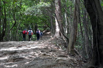 高尾山稲荷山コースの特徴は、木の根っこが露出した踏み跡の多い幅広の山道で、日差しの当たる新緑の木々も見ごたえがあります。尾根道ですので、爽やかな風に吹かれながら歩けます。