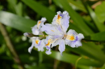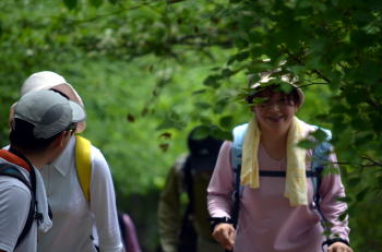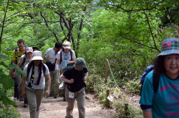 山道の至るところに咲いていた花は『シャガ』でした。アヤメ科アヤメ属の多年草だそうです。先ほどから滑ちゃん達の背後には、知らないおじさんが一緒になって歩いていました。