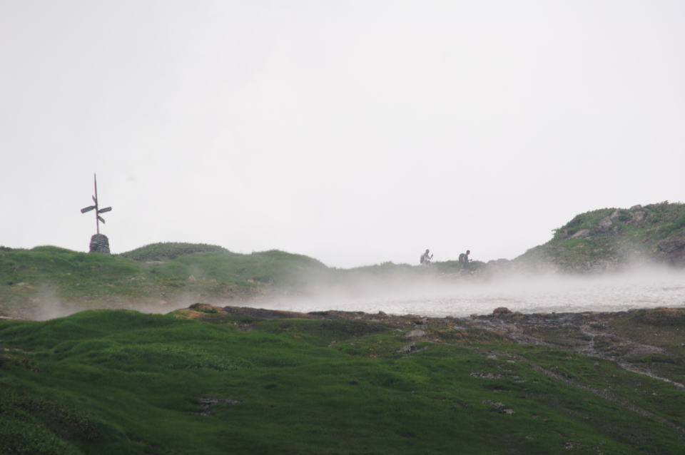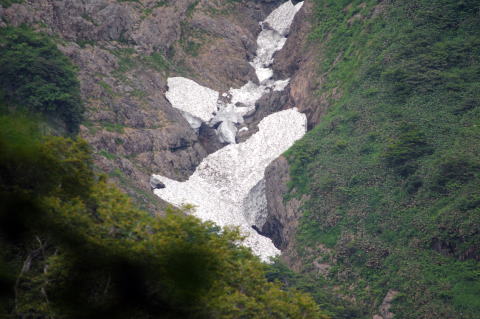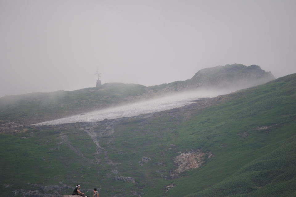 | 振り返ると、雪渓から冷気が上がって神秘的に見えます。