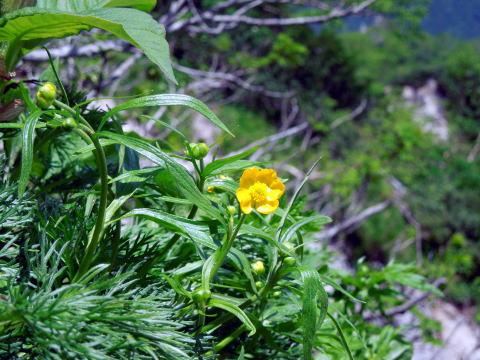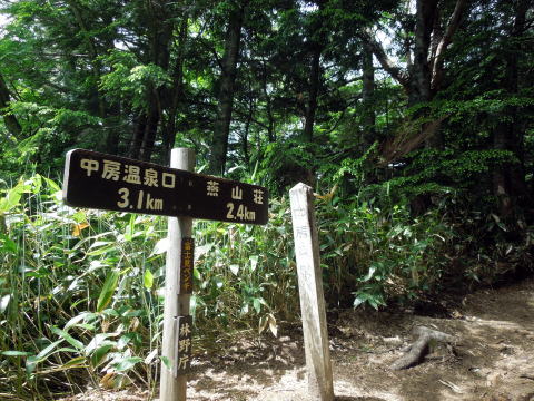 山道は迷う事のないしっかりと整地された道ですが、岩道や木段の結構急な登りの連続です。間もなく第一ベンチ休憩場所があり、少し下がった所に水場があります。前日、天候が良かったからか、燕山荘宿泊帰りの方と続々とすれ違います。中学校の林間学校が100名位下山していました。(「上下長袖ジャージでえらいなあ・・・」と感心です。下りてこられる方々に「山頂からのお天気はどうですか?」と、お聞きすると、「いや〜、今日は最高ですよ。朝は富士山までぱっちり見られましたから」と。山頂景色に期待をし、自然に登る足に力が入ります。
