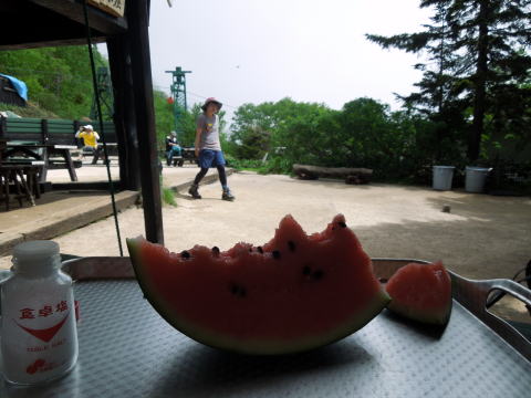 途中、合戦小屋まであと10分、あと5分、と案内版が出て来ますが、「合戦小屋まで、なんと長い道のりなんだ・・・」、と疲労と共にマイナス思考に陥り、すぐさま、「合戦小屋で名物のスイカが待っている」と自分を励まし、プラス思考にコントロールです。すると、不思議な程、あっと言う間に着くものです。スイカ売りのお兄さんが、「待ってました」と言わんばかりに「お疲れ様でした」と声を掛けて下さり、スイカを頂きます。なんと、8分の1カットの大きなスイカです。「ええ〜!これを食べるの?」と上品な私は、絶句です。お兄さんは、半分に切りましょうか?と言ってくれましたが、何事もチャレンジです。「このままいきます!」と食べ始めました。疲れた体に冷えたスイカは最高です。(@800円)