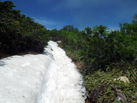 次第に眺望が開け始めます。左手に大天井岳を見ながら標高を上げると残雪が残っています。