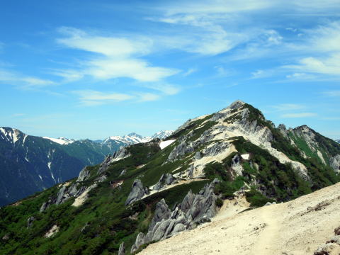 北アルプスの入門コースと言われる燕岳。中房温泉登山口から合戦尾根まで樹林帯で眺望は殆どありませんが、要所に休憩ポイントの第一ベンチ、第二ベンチ、第三ベンチ、そして「合戦小屋」があり、休憩ポイントになっています。「合戦小屋」を過ぎると次第に眺望は開け、北アルプスの始まりの素晴らしい景色が見え始め、やがて「燕山荘」が高台に見えてきます。以降は、絶景のオンパレードです。「燕山荘」までのコースは、この時期ですとまだ三か所程残雪があり、歩きにくくなっていますが、軽アイゼンを使うほどの距離でもありません。(ステッキ使用ならば、安心です)※合戦尾根は北アルプスの三大急登になっています。