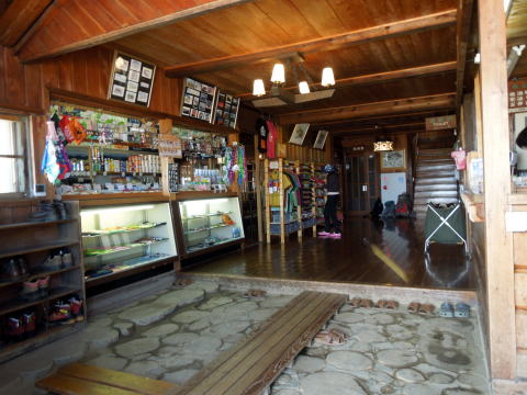 燕山荘到着です。ワークの宿泊の予約をします。中の売店は、品物が豊富です。