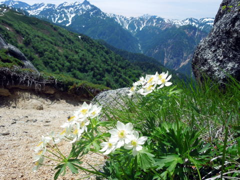 ここは、高山植物の女王、コマクサの群生地としても有名な場所です。自然探索の日には、もっと群生がみられると思います。高山植物(ハクサンイチゲなど)が沢山咲いています。花や残雪の残る素晴らしい日本の天井アルプスを目にして、心がリフレッシュします。
