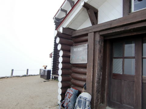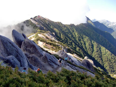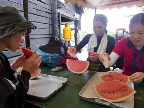 ようやく、合戦小屋(標高2370m)です。高低差900mを越えましたので、疲労が溜まって来ます。ここでは名物の長野波田産スイカを塩をたっぷりかけて頂きます。疲れた体にスイカの甘さと、塩分が体に元気を与えてくれます。山小屋で冷たいスイカが食べられるなんて、感激です。もれなく全員完食です。