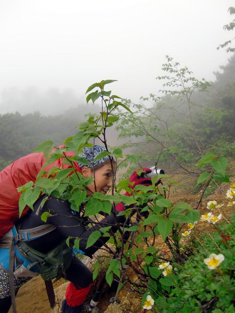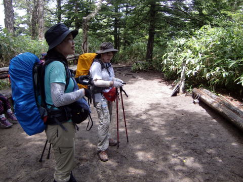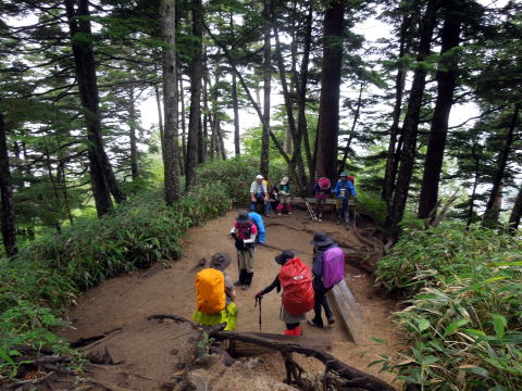 30分おきに休憩ベンチが設置されている親切な登山道で、混雑しているためベンチ毎に全員が揃うのを待ちます。合戦小屋で昼食の予定でしたが、手前一時間くらいの第三ベンチ(標高2050m 高低差588m)でお弁当を広げます。食事が終わるころ雨が降って来ましたので、忙しく撤収します。「初レイン(コート)使用!」と、喜んでいるのはタミ―です。流石レギュラーの貫禄です。いかなる時にもプラス思考で、快適達人の域に達しているではありませんか!?