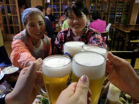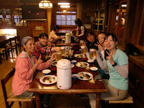 燕山荘は、昨日も明日も大きな団体があったそうですが、本日は大きな団体はないようです。下見時に予約をしておいたので、グループで一部屋個室を借りることができました。自然探索のスタート地に全員無事到着でき、生ビールで乾杯です。