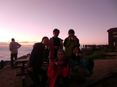 一晩中、雨音が止みまず、降るだけ降ったら気が済んだのか、夜明けと共に山頂は快晴の気配です。昨日は悪天候の為、サンセットが見られませんでしたので、サンライズに期待をしていました。ご来光と共に、モーニングコーヒーを頂きます。