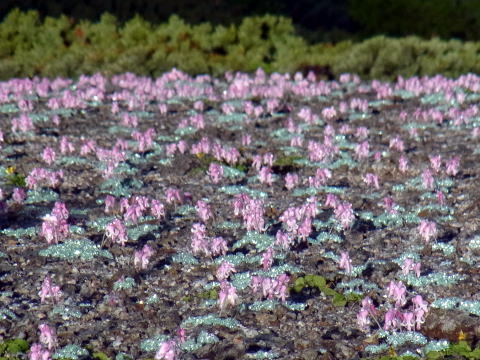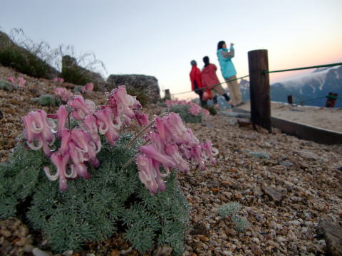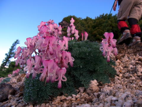 花崗岩の砂地帯に広がるコマクサの群生です。どれも、朝露に濡れてひと際輝いています。メンバーの境地も同化していたことでしょう。