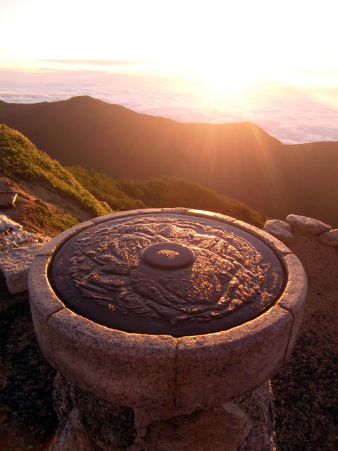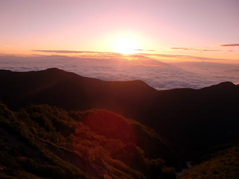 | 北アルプスも雲海が日の出と共に開けていき、全容が見えてきます。ここにいたのか、とびっくりするほど、沢山の山波が目の前に広がります。 |