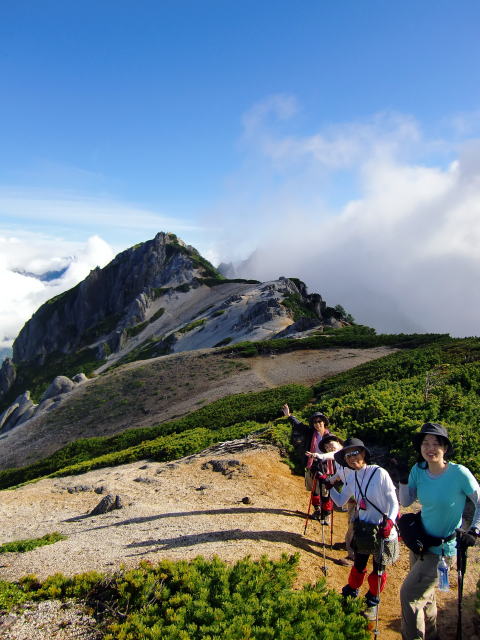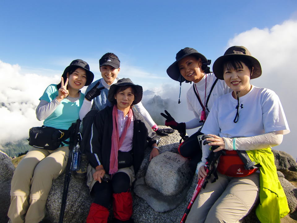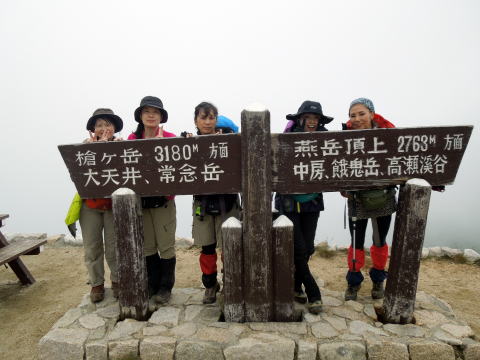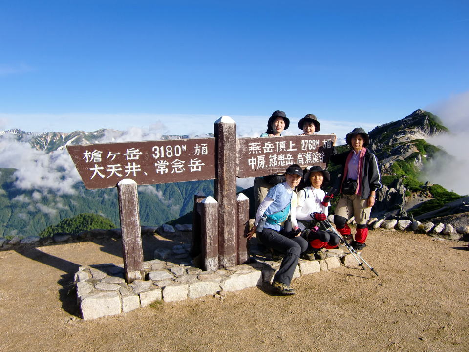 燕岳山頂(標高2763m)登頂です。あきらめず頑張り続け辿り着けた自信と誇り、そして、雲上で味わう山頂の空気に感動はひと際です。