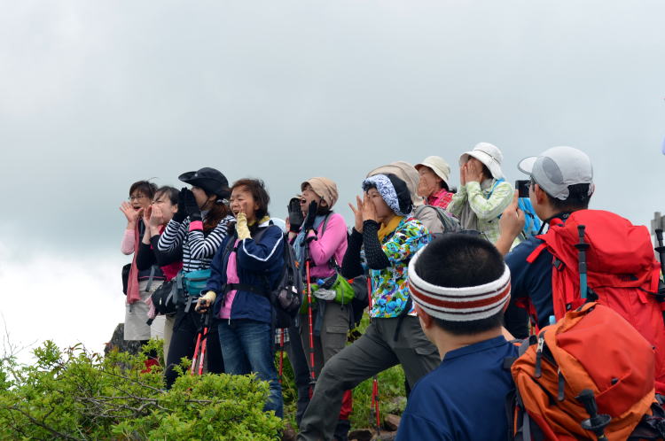 恒例のヤッホー!静かになった烏帽子岳山頂より北アルプス方面をめがけ、豪快に声を張り上げ、ファイト一発です。