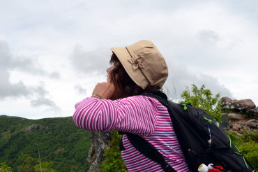 爽快なゴロ石の山頂に到着です。人気者の“なめちゃん”はメンバーに向かって登頂のVサインです。皆さん、すかさず笑顔で返します。