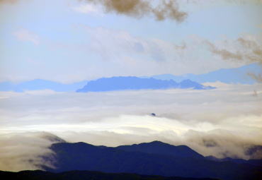 尖がり頭の烏帽子岳右側に四阿山と根子岳が見えます。秩父方面には両神山が雲海からキザキザ頭を出し、幻想的です。