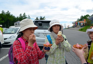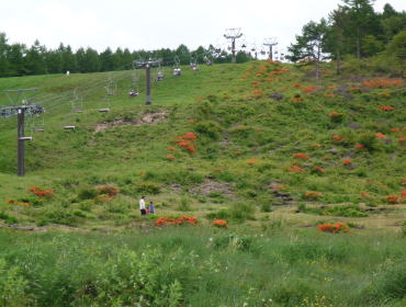 帰着後はしばらくの自由行動で、皆さんソフトクリーム売場に群がります。朝見えなかったリフト付近の牧場は、疎らにツツジの赤い斑点が目立っていました。